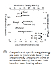 - The chart is showing that on the Y axis, the higher you are the more fuel you can fit in a specified volume. The X axis is showing how much energy is contained in a specific mass. Ideally, a fuel would be on the top right quadrant. Hydrogen contains almost 3x more energy per kg than jet fuel, but it requires more volume to store it. This is why hydrogen storage is one of the top research topics. If we can figure out a way to store more hydrogen per volume, it will be far superior to any other fuel we’ve ever worked with, with no carbon emissions. However, we can fly with hydrogen today, with zero emissions, the flights just might not look exactly like traditional flights.
